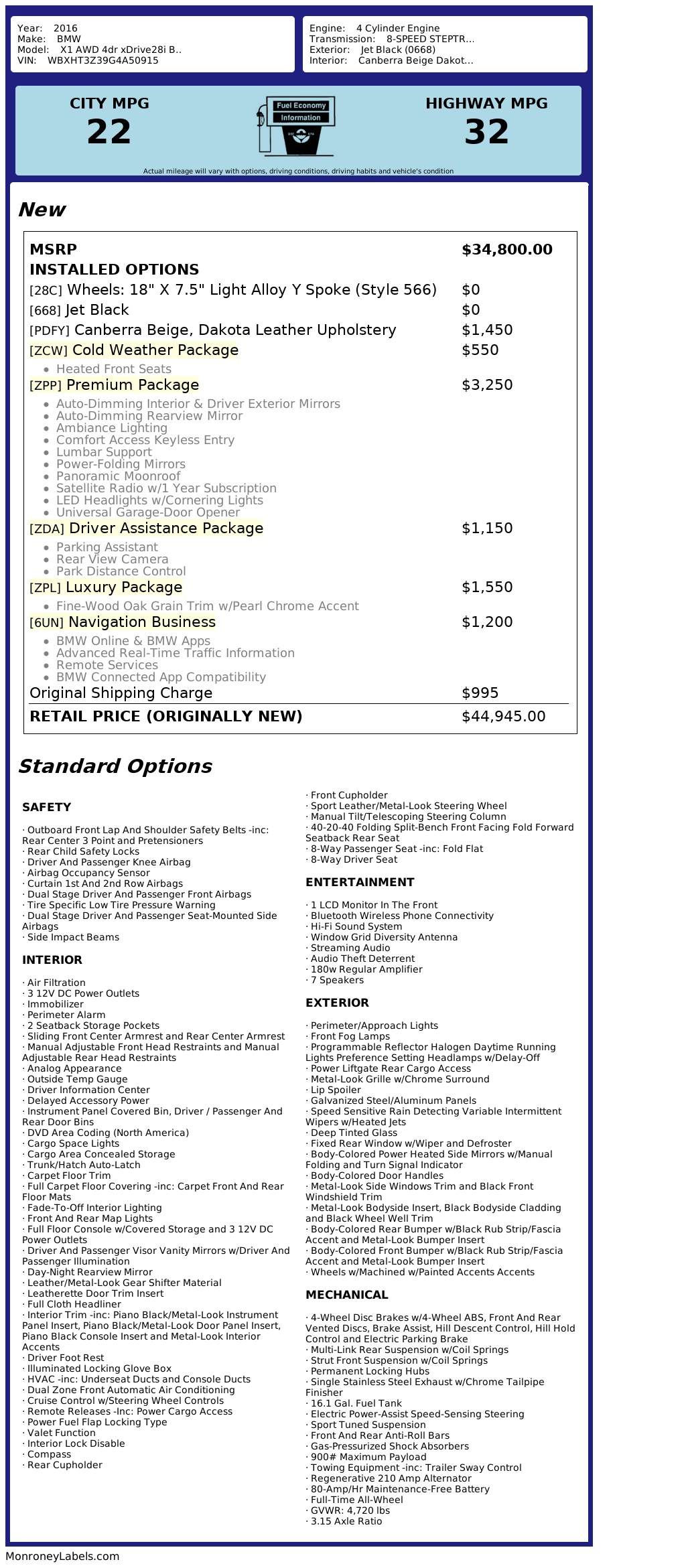 additional equipment [ZPP] premium package $3,250.00